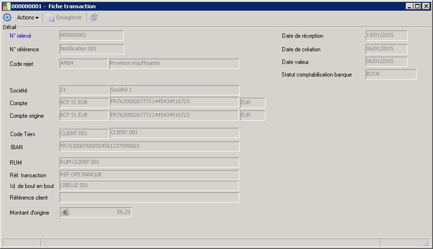 (Sage FRP 1000 Trésorerie) Menu Banque Paiement > Relevés et Notifications > Relevés de notifications > Fiche transaction