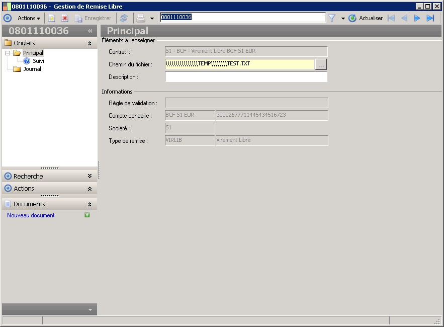 Cette zone obligatoire indique le chemin du fichier à envoyer dans le cadre d'une remise de virements libres.Notez que ce chemin n'est plus modifiable lorsque la remise a commencé son circuit de validation. |