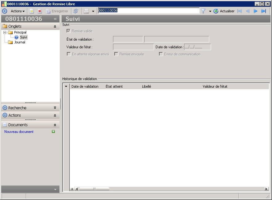 L'état valide d'une remise autorise sa transmission à la banque. Cet état est défini par la validation du dernier état du circuit de validation de la remise. En l'absence de règle de validation à appliquer sur la remise, celle-ci est considérée comme valide dès sa création.Ce n'est pas le statut valide de la remise qui empêche l'ajout d'ordres à celle-ci : c'est le statut généré qui détermine cela (cf. statut généré de la remise pour connaître le moment de génération du fichier de la remise).Il reste néanmoins possible de ré-initialiser la remise afin d'y ajouter de nouveaux ordres. Cette procédure exceptionnelle a pour effet de la remettre à l'état initial de son circuit et de supprimer le cas échéant le fichier généré. Les ordres qui composent la remise sont conservés au niveau de celle-ci.Une remise valide peut être supprimée : les ordres qui la composent seront alors disponibles pour la constitution d'une nouvelle remise. |