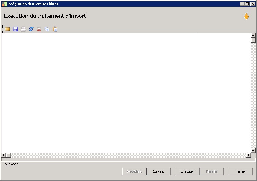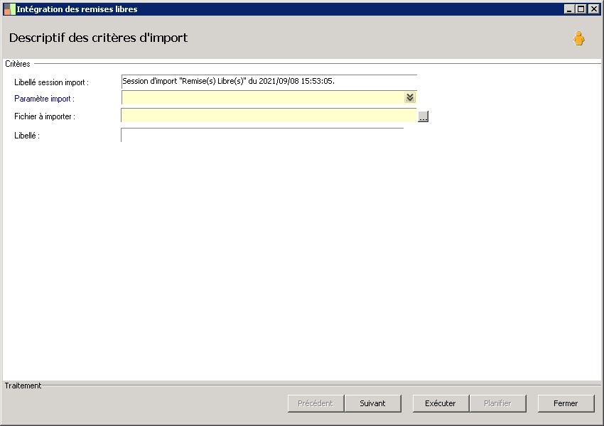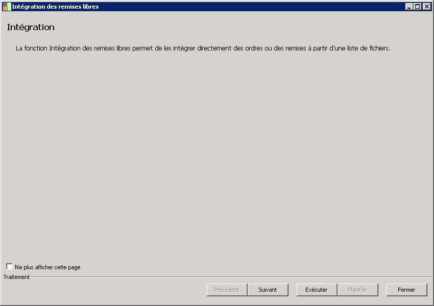 Remise de virement libre.Cette remise est saisie par l'utilisateur, elle est utile lorsque l'utilisateur souhaite envoyer un fichier dant le format est inconnu à MP1000.Il renseigne un contrat, un fichier. |