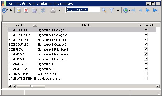 (Sage FRP 1000 Trésorerie) Menu Banque Paiement > Paramètres > Ordres et remises bancaires > Liste des états de validation des remises