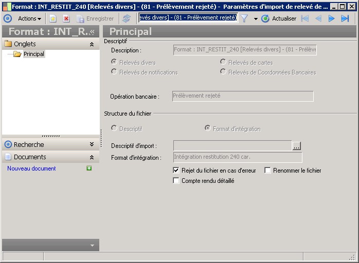 Ce champ indique le type de paramètres d'import bancaire :0 = Relevés divers.1 = Relevés de notifications.2 = Relevés de cartes.3 = Relevés de frais bancaires (réservé).4 = Relevés d'encaissements chèques (réservé).5 = Relevés de Cartes affaires (réservé).6 = Relevés de Coordonnées Bancaires. |