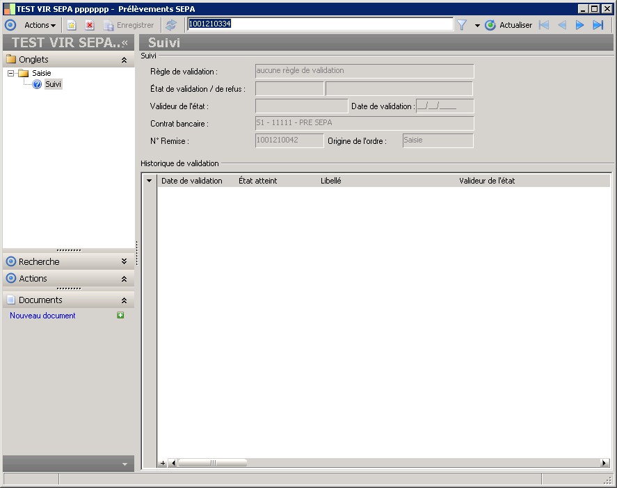 La nature de validation détermine la règle de validation qui sera liée à l'ordre. La nature est elle même déterminée par le groupe de validation associé au rôle du tiers de l'ordre.En l'absence d'une nature de validation, un ordre confirmé est considéré comme valide et peut faire l'objet d'une remise bancaire. |