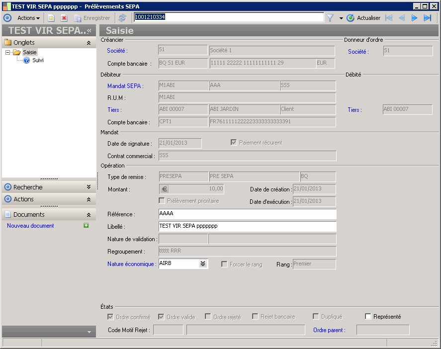 (Sage FRP 1000 Trésorerie) Menu Banque Paiement > Ordres bancaires > Prélèvements SEPA