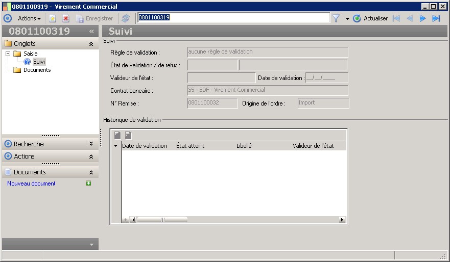 La nature de validation détermine la règle de validation qui sera liée à l'ordre. La nature est elle même déterminée par le groupe de validation associé au rôle du tiers de l'ordre.En l'absence d'une nature de validation, un ordre confirmé est considéré comme valide et peut faire l'objet d'une remise bancaire. |