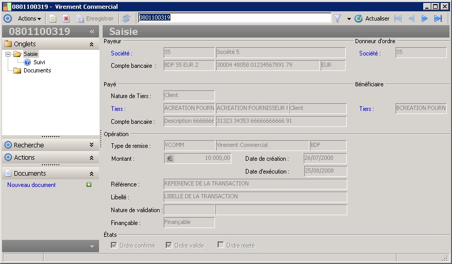(Sage FRP 1000 Trésorerie) Menu Banque Paiement > Ordres bancaires > Consultation des ordres par type > Virement Commercial