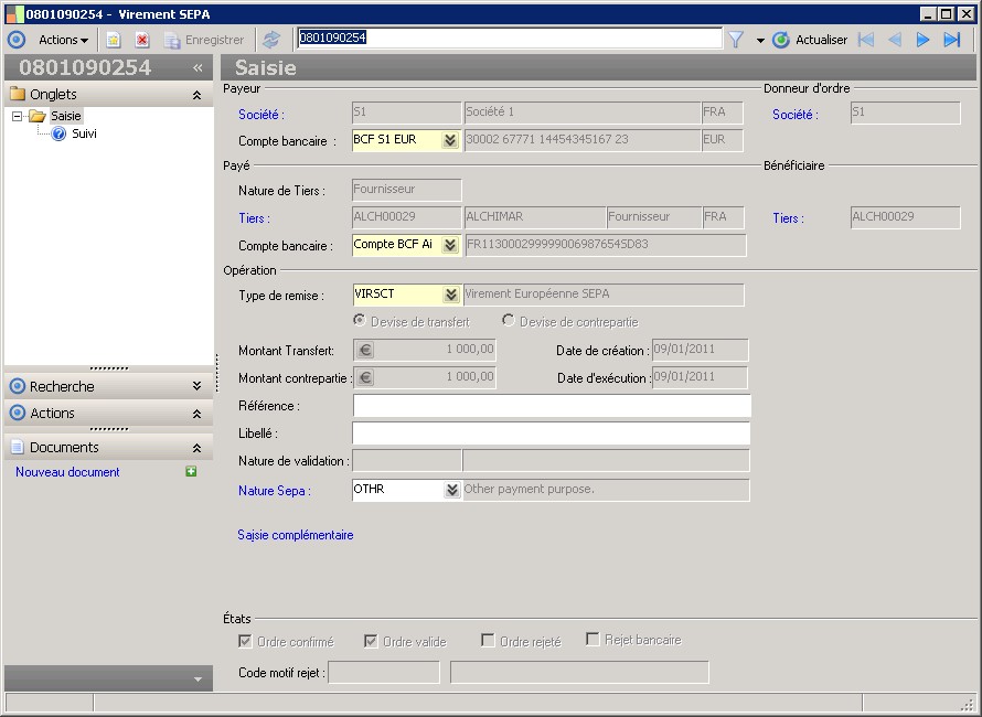 (Sage FRP 1000 Trésorerie) Menu Banque Paiement > Ordres bancaires > Virement SEPA