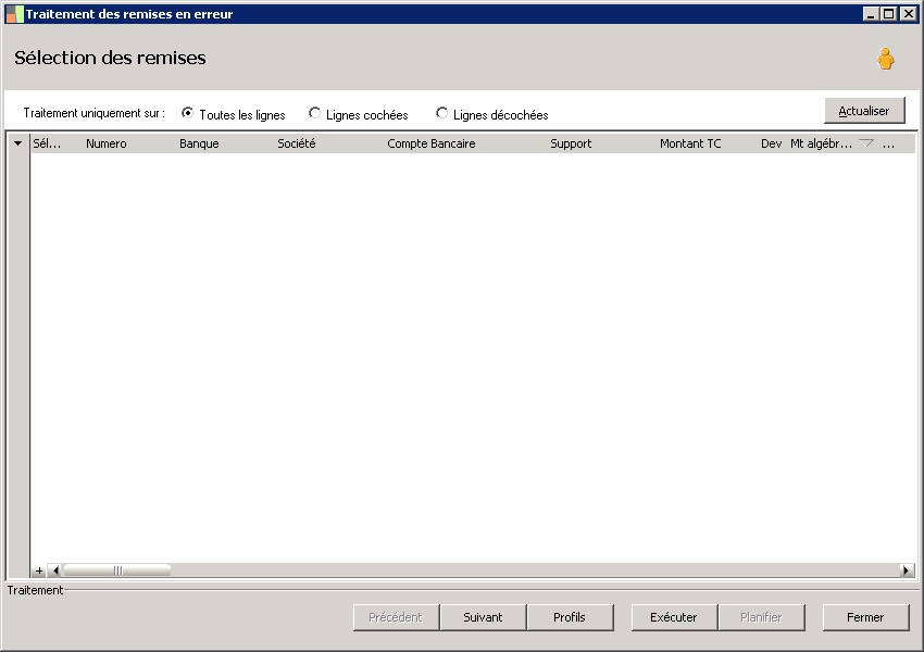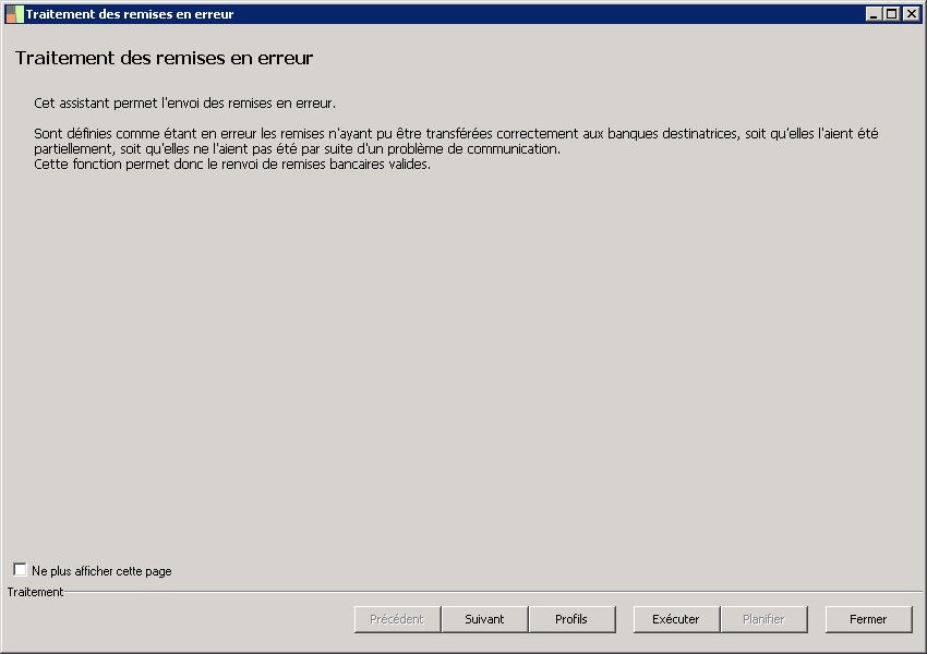 (Sage FRP 1000 Trésorerie) Menu Banque Paiement > Remises bancaires > Traitement des remises en erreur