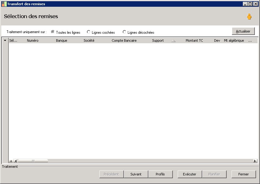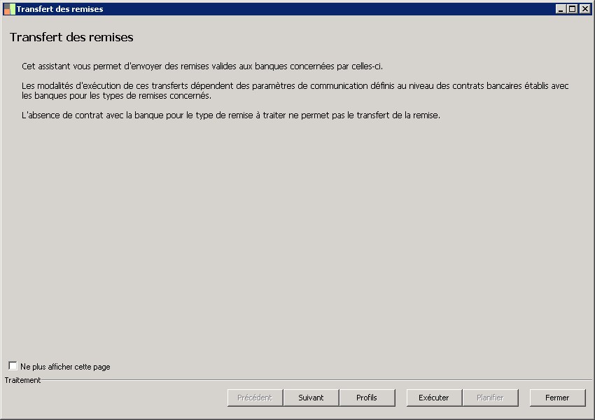(Sage FRP 1000 Trésorerie) Menu Banque Paiement > Remises bancaires > Transfert des remises