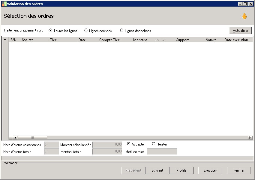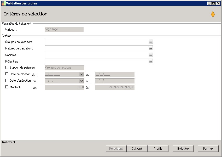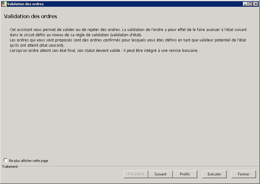 (Sage FRP 1000 Trésorerie) Menu Banque Paiement > Ordres bancaires > Validation des ordres
