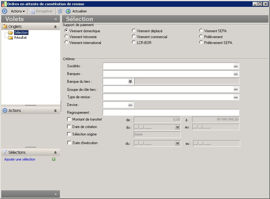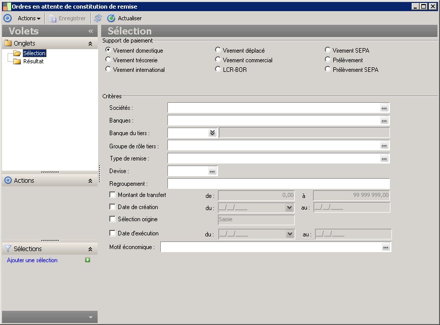 (Sage FRP 1000 Trésorerie) Menu Banque Paiement > Remises bancaires > Ordres en attente de constitution de remise