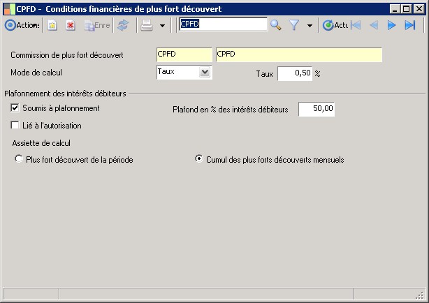 Le plafonnement indique si oui ou non la Commission de Plus Fort Découvert est plafonnée par rapport au montant des intérêts débiteurs calculés. |