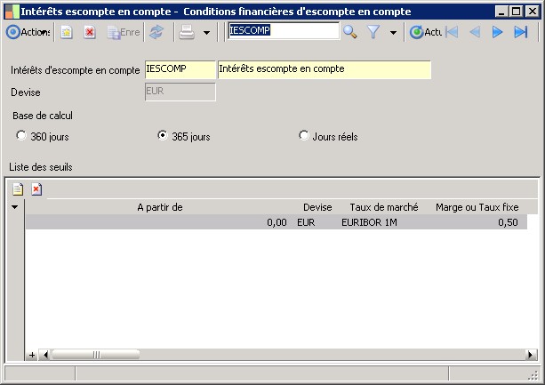 (Sage FRP 1000 Trésorerie) Menu Trésorerie > Paramètres > Echelles d'intérêts > Conditions financières d'escompte en compte
