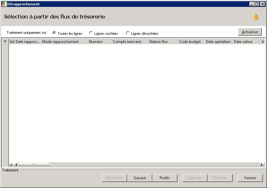 Cliquez sur le bouton [Actualiser]; les flux (bancaires ou de trésorerie) correspondant à votre sélection s'affichent immédiatement. |