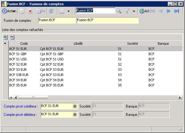 (Sage FRP 1000 Trésorerie) Menu Trésorerie > Paramètres > Banques > Fusions de comptes