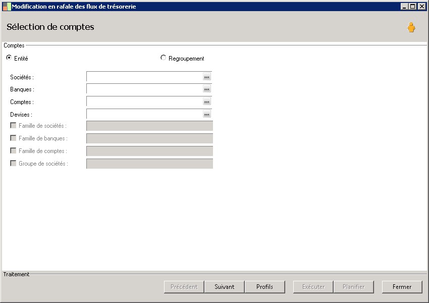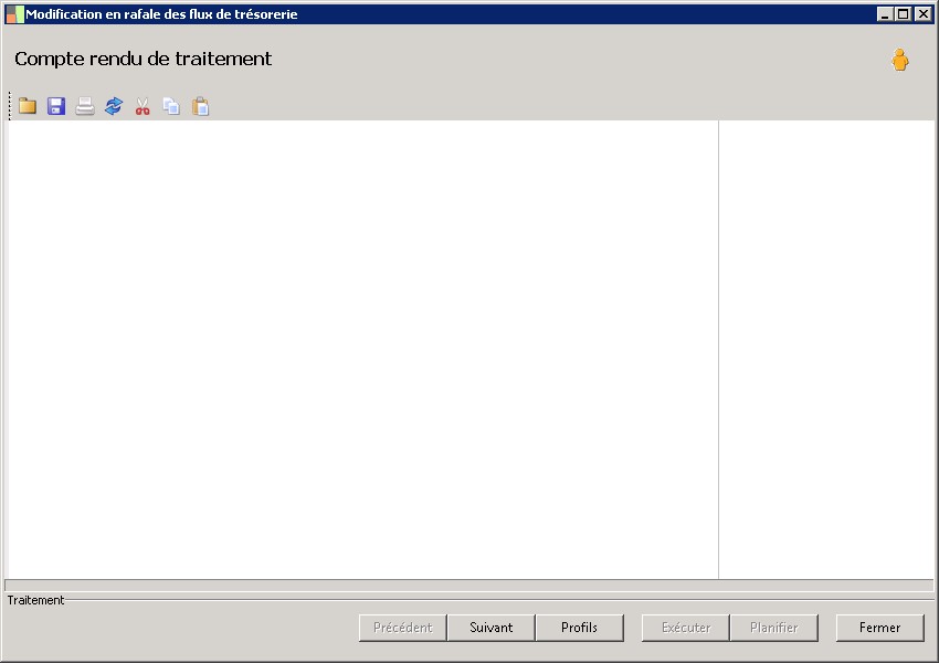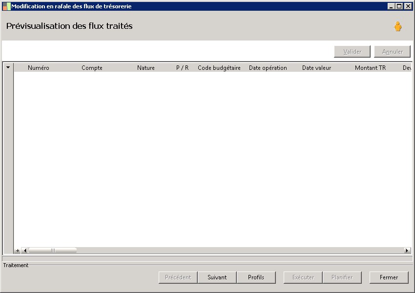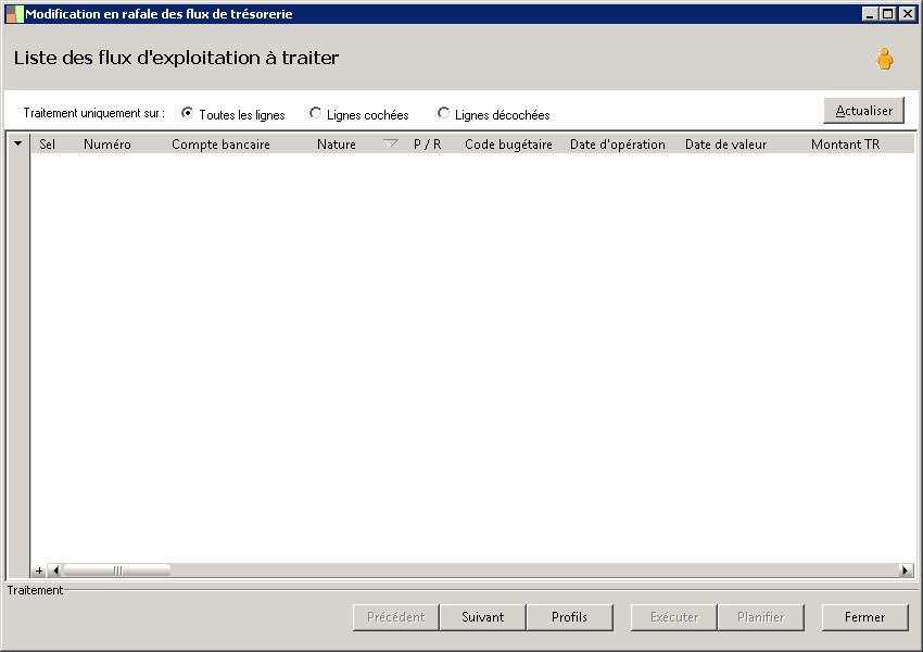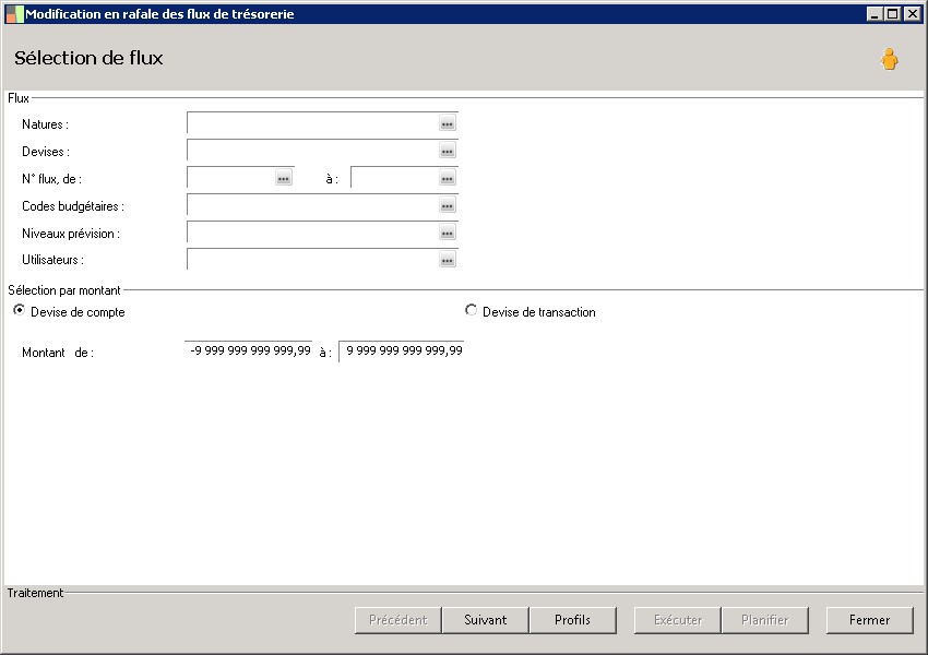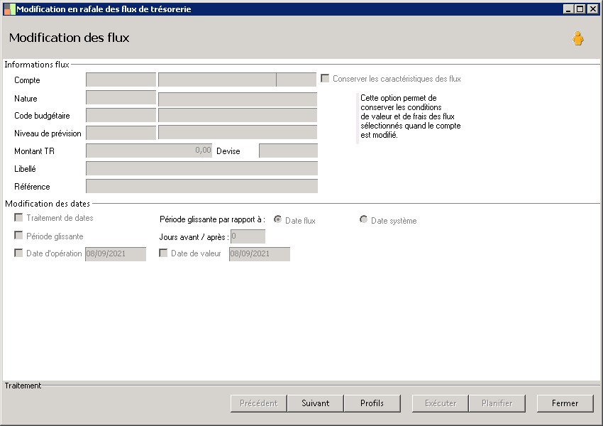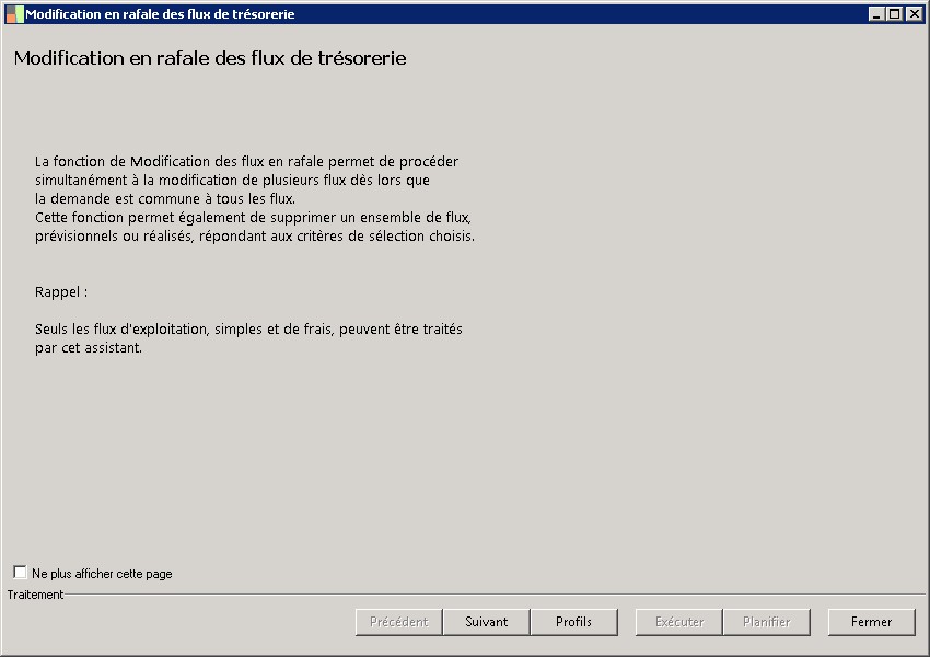 (Sage FRP 1000 Trésorerie) Menu Trésorerie > Flux de trésorerie > Modification en rafale des flux de trésorerie