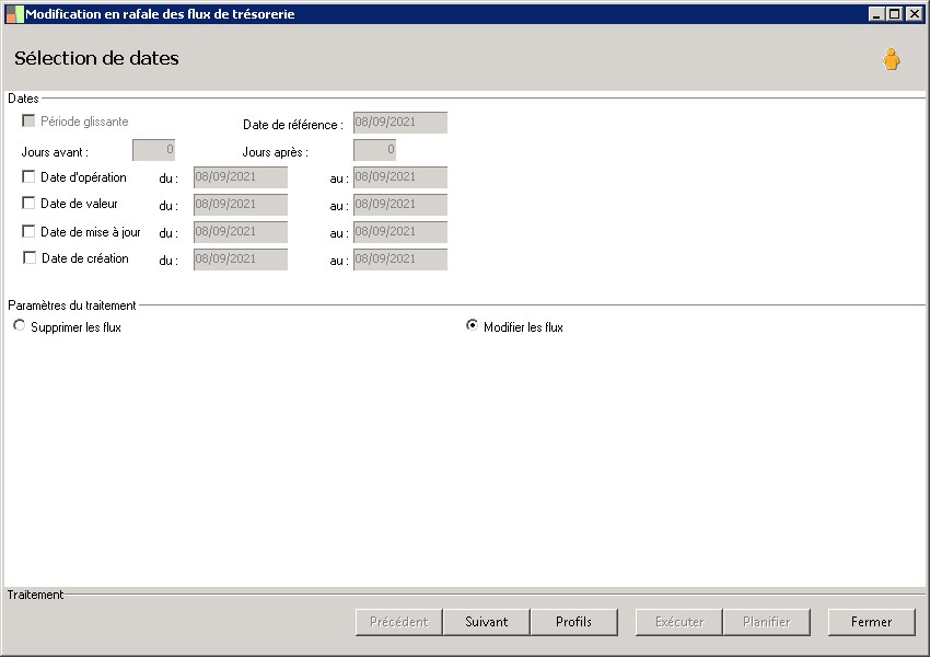 Ne peut être utilisé qu'en ayant prélablement coché "Traitement de dates".Si "Période glissante" n'est pas coché, cocher "date d'opération" permet de sélectionner la nouvelle date d'opération à affecter aux flux. Si "Période glissante" est coché, cocher "date d'opération" indique que le décalage des jours portera sur la date d'opération. |