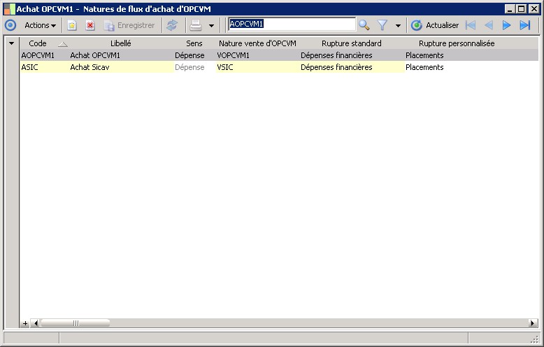 (Sage FRP 1000 Trésorerie) Menu Trésorerie > Paramètres > Généraux > Natures de flux d'achat d'OPCVM