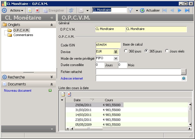 (Sage FRP 1000 Trésorerie) Menu Trésorerie > Paramètres > Généraux > O.P.C.V.M.