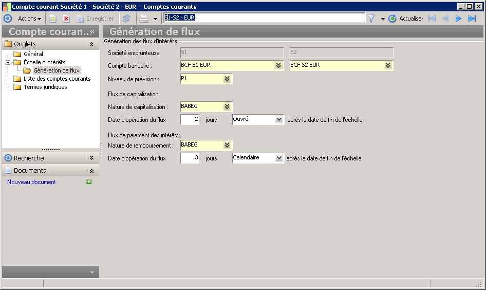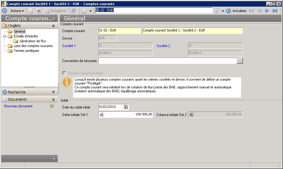 Lorsqu'il existe plusieurs comptes courants ayant les mêmes sociétés et devise, il convient de définir un compte courant "Privilégié". Ce compte courant sera initialisé lors de création de flux (saisie des BAB, rapprochement manuel et automatique (création automatique des BAB), équilibrage automatique). |