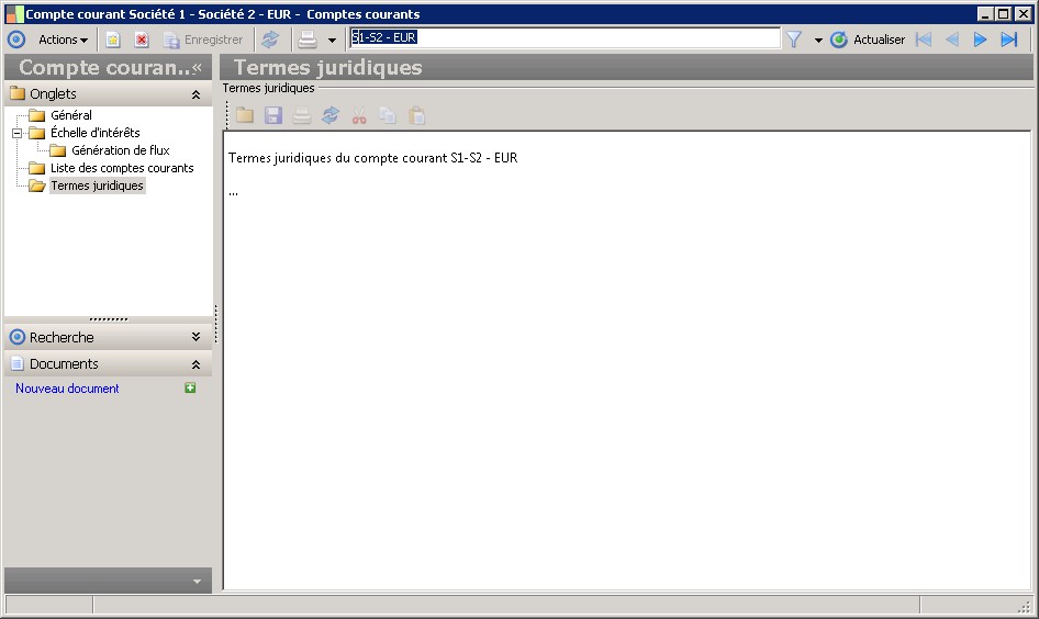Zone de saisie libre permettant de renseigner les termes juridiques du compte courant. Ces éléments pourront être repris optionnellement lors de l'édition des factures intra-groupes. |
