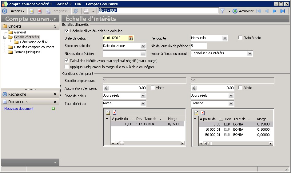 Lorsque le montant du solde est positif, les intérêts sont à 0.Lorsque le montant du solde est négatif :- si le taux est positif, l'intérêt est négatif- si le taux est négatif et que l'option n'est pas cochée, l'intérêt est à 0 ; si l'option est cochée, l'intérêt est calculé en positif. |