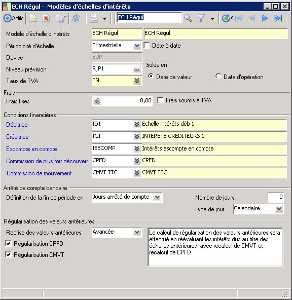 Si la banque adresse des échelles d'intérêts ne comportant pas de régularisations de valeurs antérieures, il faut choisir l'option a Aucun b. Sinon, il existe deux types de régularisation. Si l'on choisit la régularisation a Simplifiée b, l'échelle recalculera le montant des intérêts débiteurs, d'escompte en compte et créditeurs dus au titre de la période séparant la date d'opération de la date de valeur du flux régularisé, en appliquant uniquement le premier seuil de condition paramétré (à partir de zéro).Si l'on choisit la régularisation a Avancée b, l'échelle peut recalculer l'intégralité des échelles séparant la date d'opération de la date de valeur du flux régularisé en appliquant toutes les conditions financières en vigueur au moment où les échelles intermédiaires ont été calculées ; afin d'établir le différentiel précis induit par cette régularisation.Si l'utilisateur souhaite recalculer seulement les intérêts en appliquant tous les seuils de conditions, il ne coche ni le recalcul de CMVT , ni celui de CPFD. S'il souhaite y ajouter l'un de ces deux calculs ou les deux, il suffit de cocher les options retenues. |