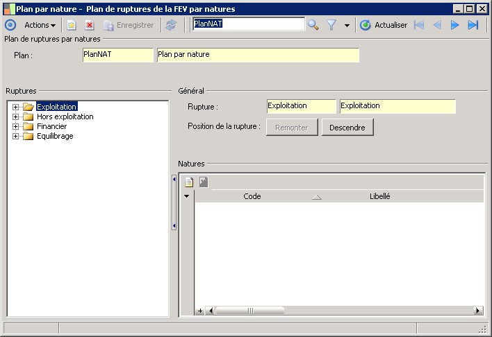(Sage FRP 1000 Trésorerie) Menu Trésorerie > Paramètres > Ruptures > Plan de ruptures de la FEV par natures