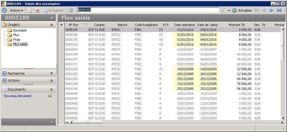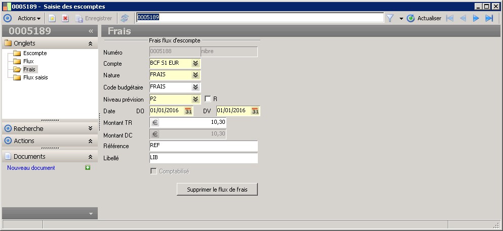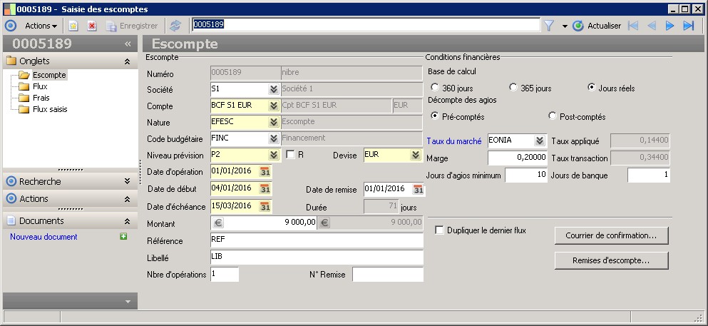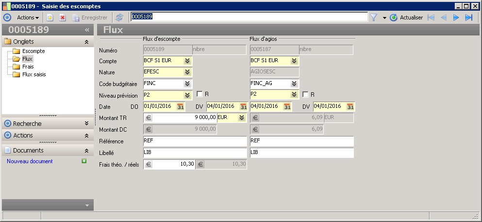 Cet écran permet de saisir les flux d'escompte si vous y accédez via le menu Flux de trésorerie. Vous pouvez également créer des flux d'initialisation en ouvrant cet écran via le menu Flux externes. |