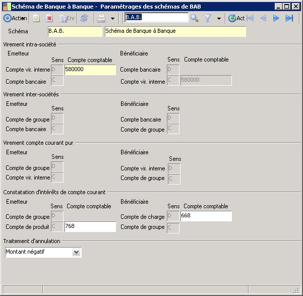 (Sage FRP 1000 Trésorerie) Menu Trésorerie > Paramètres > Schémas comptables > Paramétrages des schémas de BAB