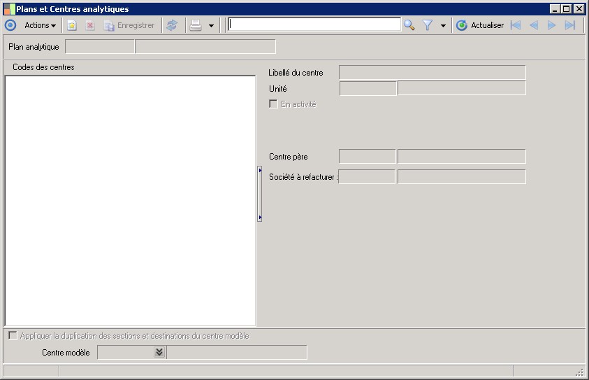 Le centre modèle sert de base lors de la création d'un nouveau centre analytique : les cohérences centre/centres et centre/nature de flux du centre modèle sont reprise pour le nouveau centre. Les sections et destinations du nouveau centre sont automatiquement générées fonction du centre modèle.Il n'est pas obligatoire de créer un centre modèle par plan.La fonction Duplication sections/destinations permet également de dupliquer les cohérences et sections/destinations d'un centre modèle. |