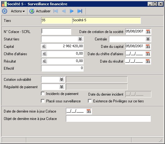 Cette zone permet de renseigner la date de dernière mise à jour Coface - SCRL.Cette zone peut notamment être mise à jour automatiquement lors des connexions au Serveur Coface via le Portail Sage pour la surveillance financière du tiers. |