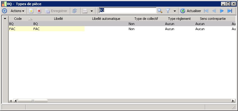 (Sage FRP 1000 Trésorerie) Menu Banque Paiement > Paramètres > Comptabilisation > Types de pièce
