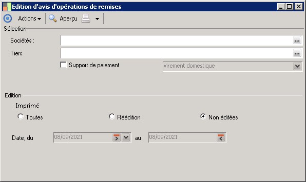 (Sage FRP 1000 Trésorerie) Menu Banque Paiement > Remises bancaires > Edition d'avis d'opérations de remises