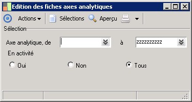 Indiquer le niveau d'activité des axes analytiques sélectionnés. Il est possible d'éditer que les axes analytiques actifs, que les inactifs ou tous les axes analytiques.
