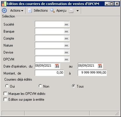 Lancement de l'édition des courriers de confirmation de ventes d'OPCVM permet d'éditer, pour les ventes d'OPCVM saisies, un courrier de confirmation aux banques concernées.