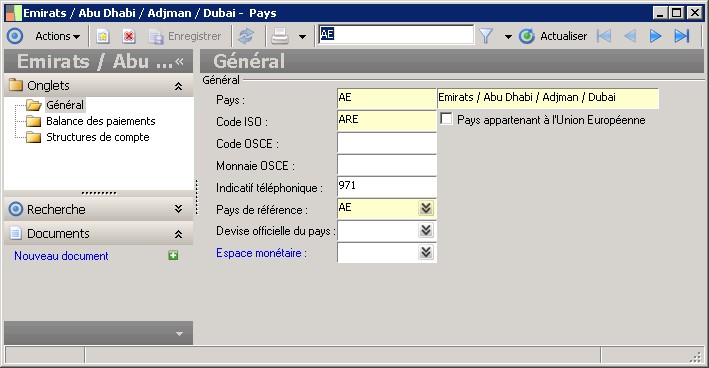Pays de référence : Cette zone permet de renseigner le code ISO du pays selon la norme en vigueur (code ISO à 3 positions). |