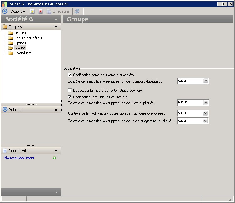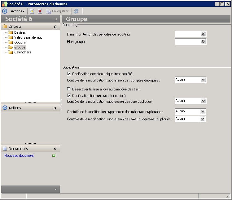 Permet de définir la méthode de codification des comptes au sein du groupe :- si la case "Codification comptes unique inter-société" est cochée : cela signifie que les comptes communs au groupe sont tous codifiés de la même façon dans toutes les sociétés du groupe et dans la société groupe.- si la case "Codification comptes unique inter-société" n'est pas cochée : cela signifie que les comptes ont leur codification propre dans chaque société du groupe. Dans ce cas il faudra attribuer à chacun des comptes de chaque société du groupe un code de correspondance compte qui permettra d'établir un lien entre les comptes des différentes sociétés.Dans le cadre d'un dossier multi-sociétés, la case "Affectation automatique des codes de correspondance comptes" est cochée par défaut. Lorsqu'elle est décochée, cela permet d'affecter manuellement un code de correspondance compte sur un compte général, différent de celui calculé automatiquement, afin de pouvoir gérer un plan comptable de reporting commun à toutes les sociétés. |