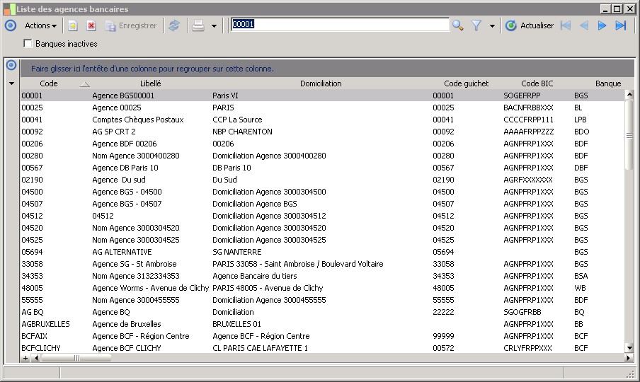 (Sage FRP 1000 Banque Paiement) Menu Banque Paiement > Paramètres > Banques > Liste des agences bancaires