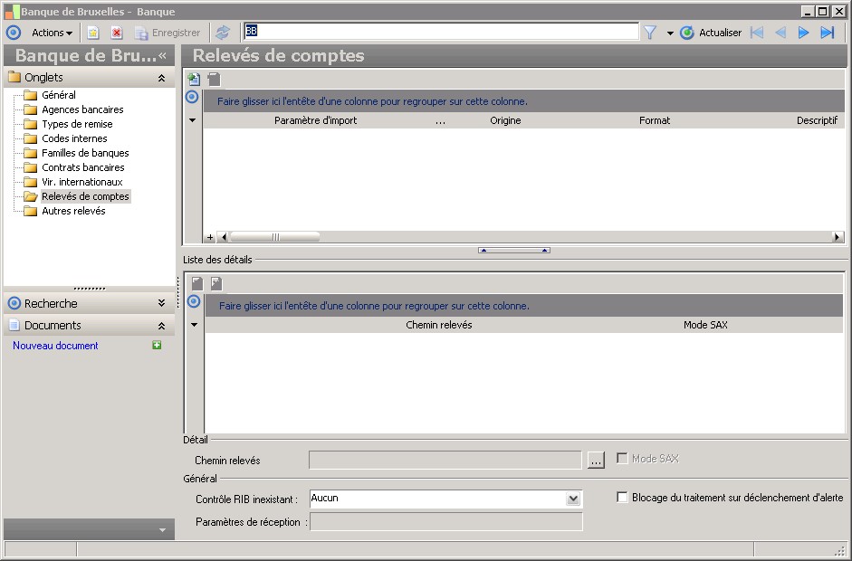 Cette option permet de contrôler l'existence des comptes bancaires lors du traitement des relevés.Si l'option est "Blocage", le traitement s'arrête si un des comptes présents dans le fichier n'est pas créé dans l'application.Si l'option est "Aucun", le traitement intègre uniquement les écritures sur les comptes existants et ignore les autres écritures. |