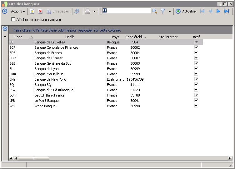 (Sage FRP 1000 Banque Paiement) Menu Banque Paiement > Paramètres > Banques > Liste des banques