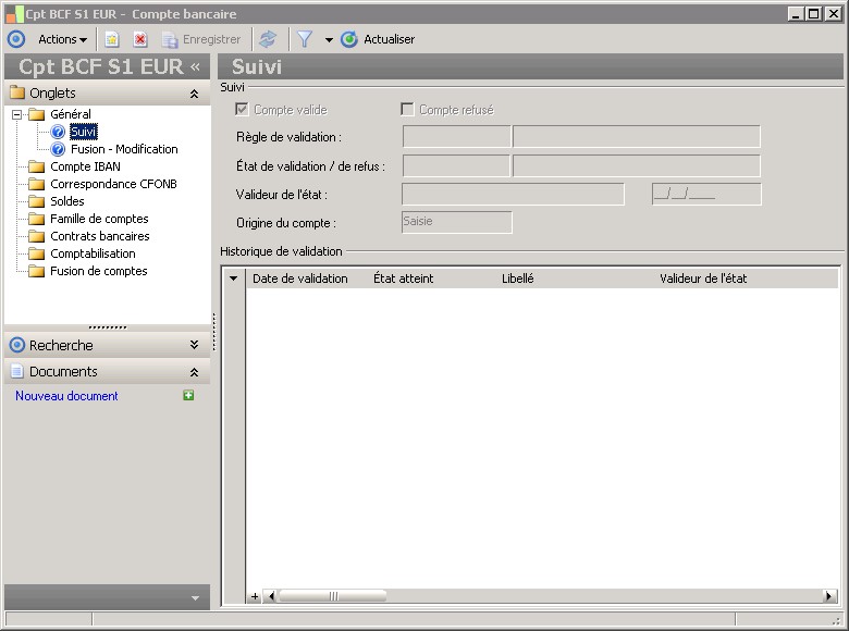 Cette zone permet de renseigner le solde initial en date d'opération du compte bancaire, soit à la création du compte bancaire, soit à la modification de la devise du compte bancaire.Cette zone est testée lors de l'importation du premier relevé bancaire afin de vérifier la cohérence des soldes. |