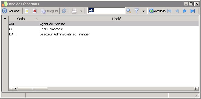 La liste des fonctions apparaît en sélectionnant la commande Paramètres / Société / Fonctions .