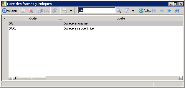 Cette fenêtre affiche la liste des formes juridiques des sociétés. Elle permet de les créer, de les consulter, de les modifier et de les supprimer si nécessaire.