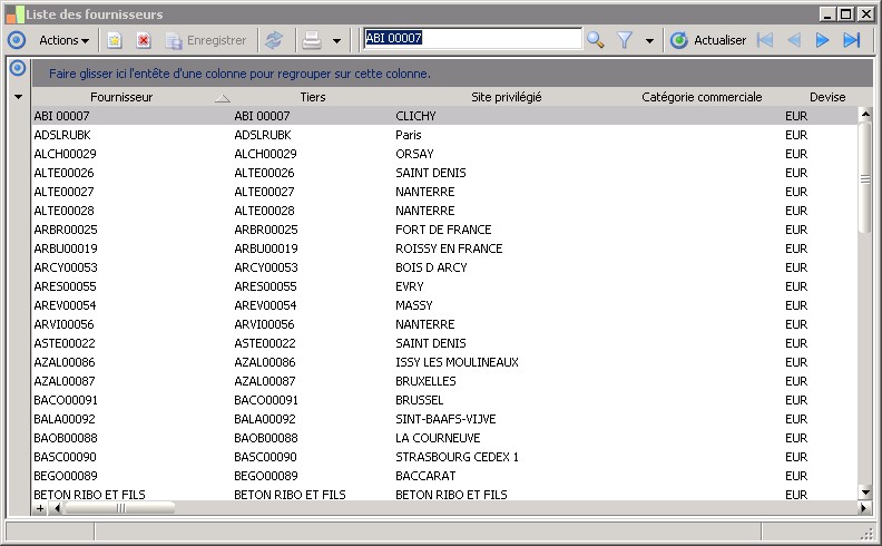 Cette fenêtre affiche la liste des tiers dont on a coché l'option Fournisseur dans le volet Général de leur fiche. Elle est ouverte par la fonction Fichiers de base / Tiers / Fournisseurs / Fournisseurs .