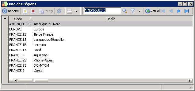 Cette fenêtre affiche la liste des régions enregistrées. Elle permet de les créer, de les consulter, de les modifier et de les supprimer si nécessaire.