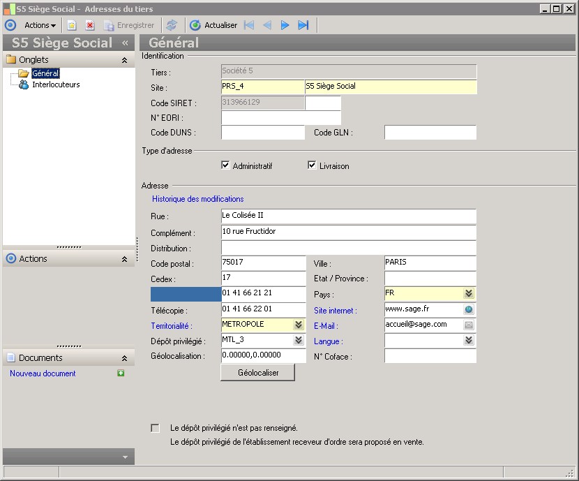 Le code permet d'identifier de manière unique un site.Au niveau de la fiche tiers, on peut gérer différents sites.Quand on attribue un rôle à un tiers, on indique le site privilégié du rôle tiers.