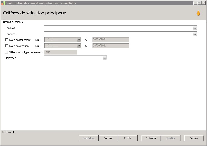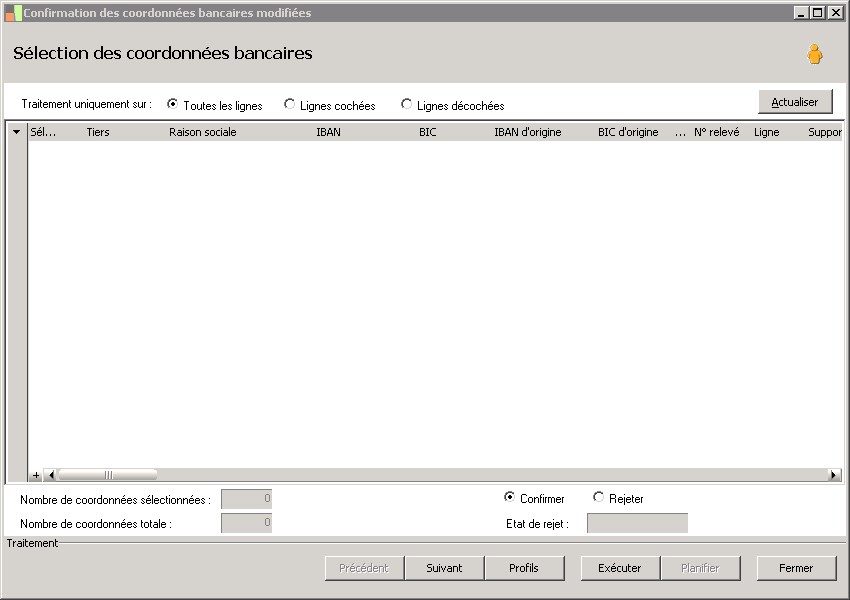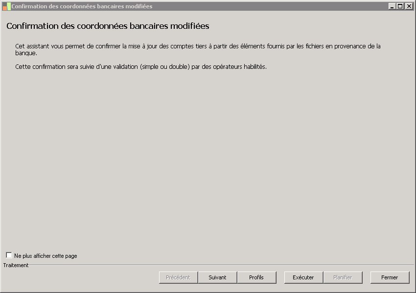 (Sage FRP 1000 Banque Paiement) Menu Banque Paiement > Relevés et Notifications > Relevés de coordonnées bancaires > Confirmation des coordonnées bancaires modifiées