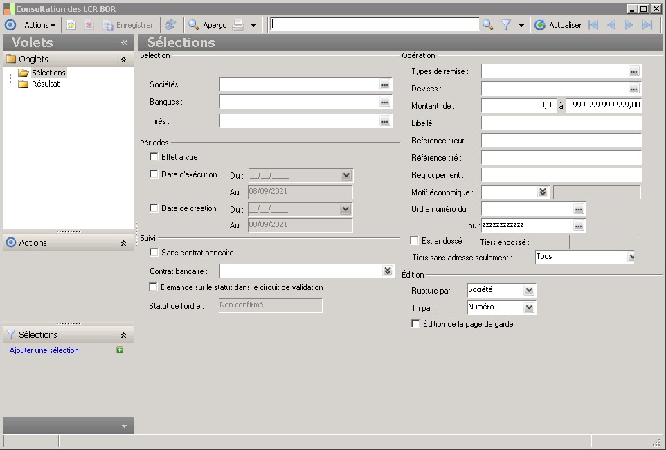 (Sage FRP 1000 Banque Paiement) Menu Banque Paiement > Ordres bancaires > Consultation des ordres par type > Consultation des LCR BOR