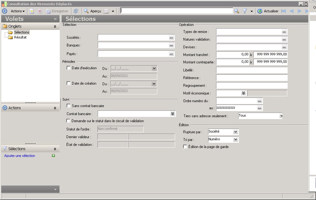 (Sage FRP 1000 Banque Paiement) Menu Banque Paiement > Ordres bancaires > Consultation des ordres par type > Consultation des Virements Déplacés